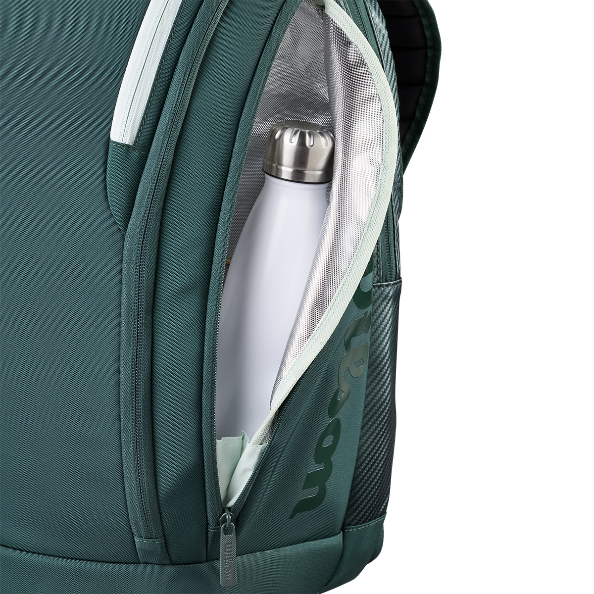 Konstrukcja tej torby, składająca się z przetworzonego poliestrowego materiału PET z recyklingu, wykonanego z 10 butelek PET, doskonale się prezentuje dzięki głebokiej zielonej barwie i z wytłoczonym logo Wilson.