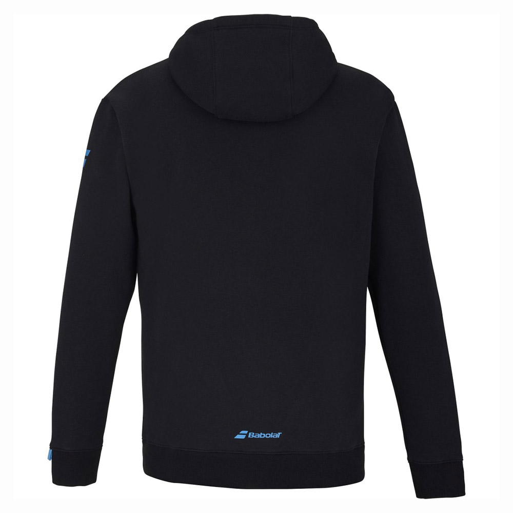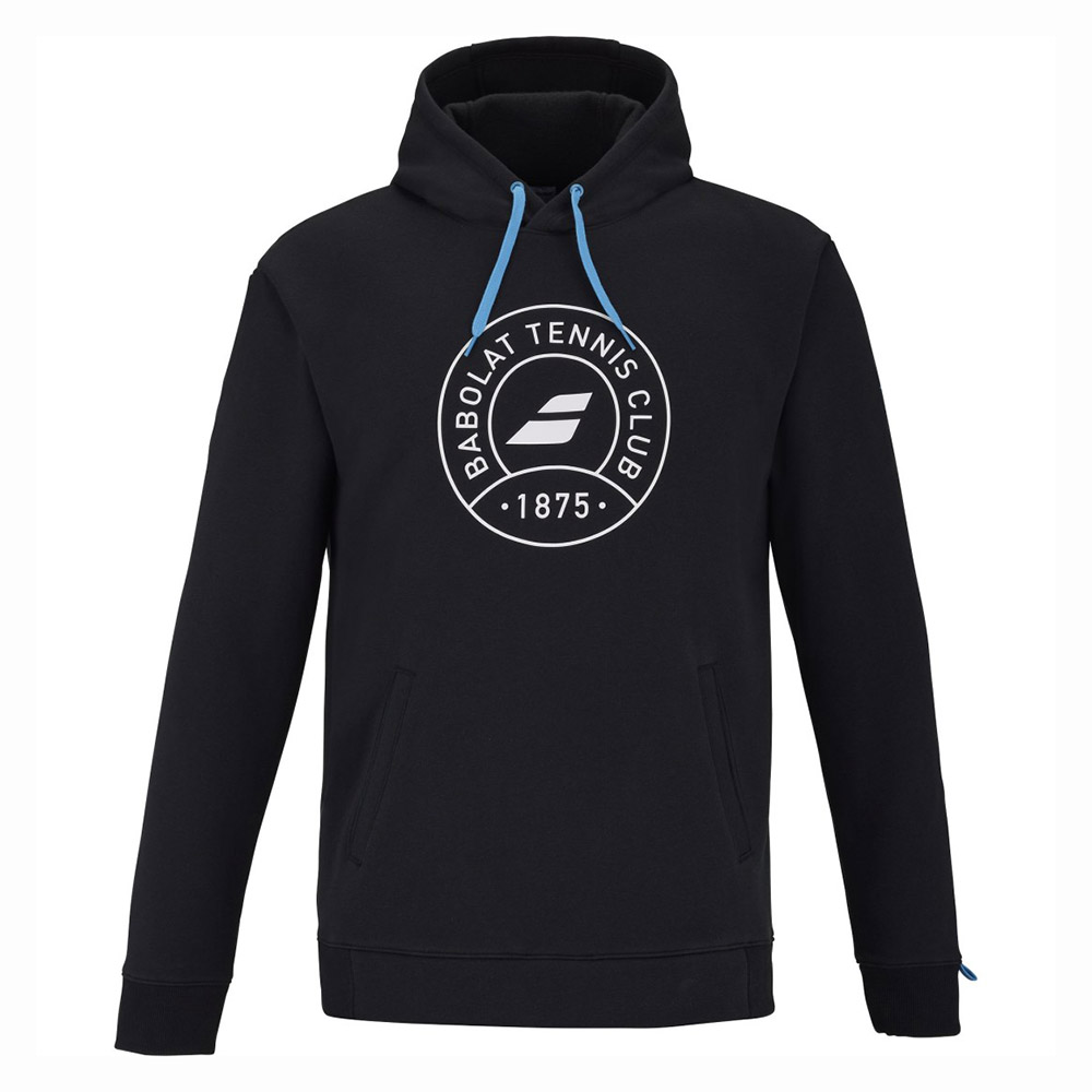 Czarna bluza męska z kapturem, z przodu napis 'Babolat Tennis Club'. Zrobiona z ciepłej, miękkiej i przyjemnej w dotyku tkaniny z dużą zawartością bawełny - idealna na zimniejsze dni lub na co dzień.